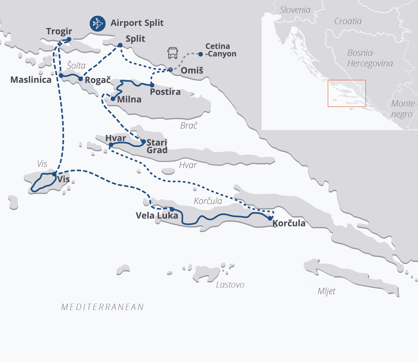 Standaard: Deze tour wordt vaak tezamen met de mountainbiketour “Zuid-Dalmatië” aangeboden op hetzelfde schip, waarbij één gids de hybridefietsgroep begeleidt terwijl de andere gids de mountainbikegroep leidt. De mountainbike producten zijn alleen beschikbaar voor gasten die deelnemen aan deze offroad mountainbike routes, meer informatie over deze offroad routes kunt u vinden op de website van ons merk Islandhopping.